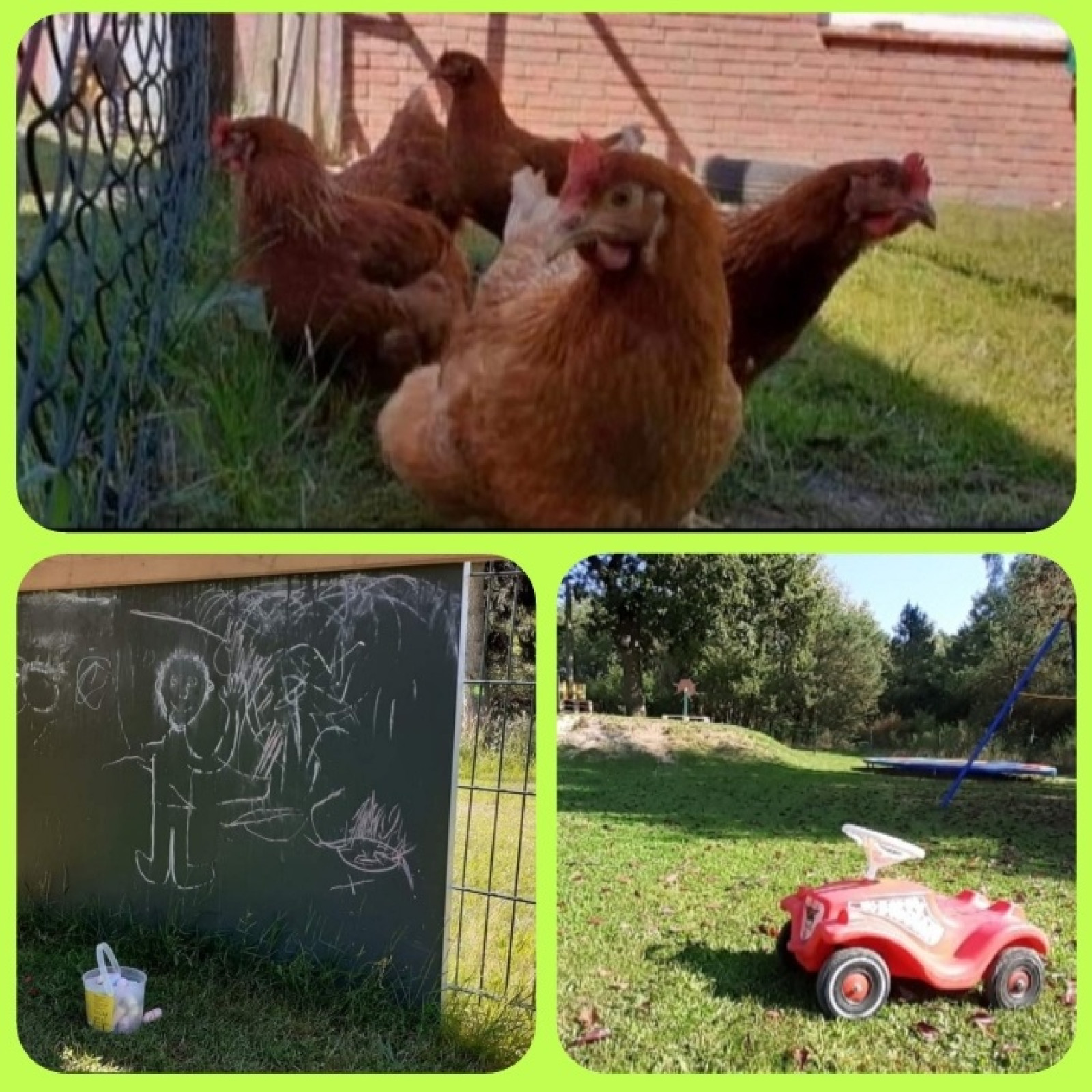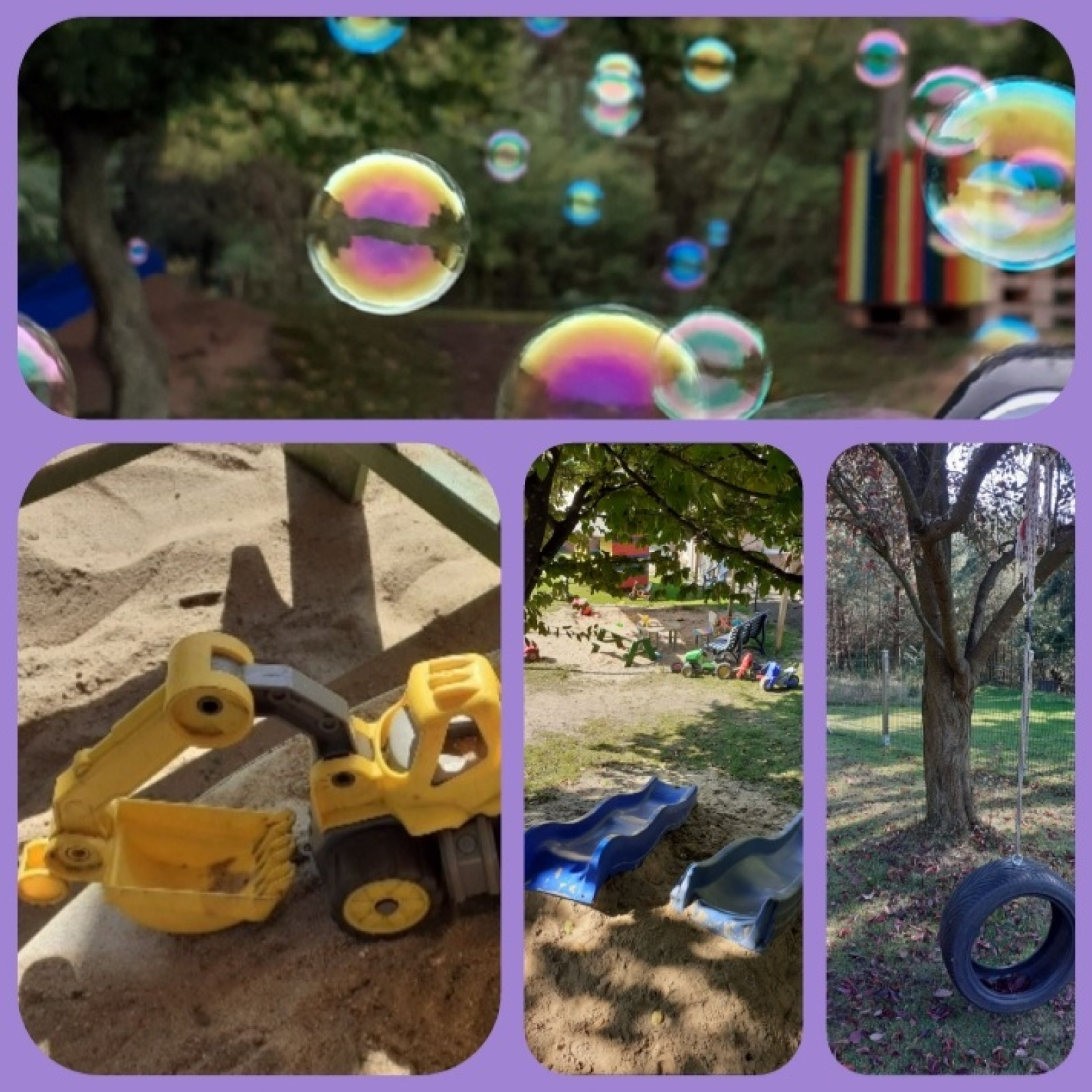 Unser großer Garten mit Rutschen, Schaukeln, Trampolin und überdachter Sandkiste, bietet viel Platz zum entdecken, wachsen und einfach Kind sein dürfen.